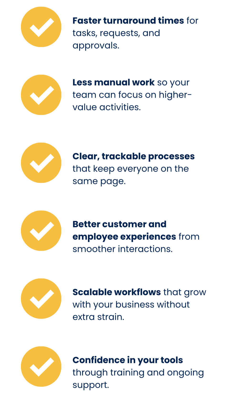 Even the best workflows won’t succeed without adoption. We support you through the rollout with simple how-to guides, training, and change management support. We make sure your team understands what is changing, why it matters, and how to use the new process confidently from day one.